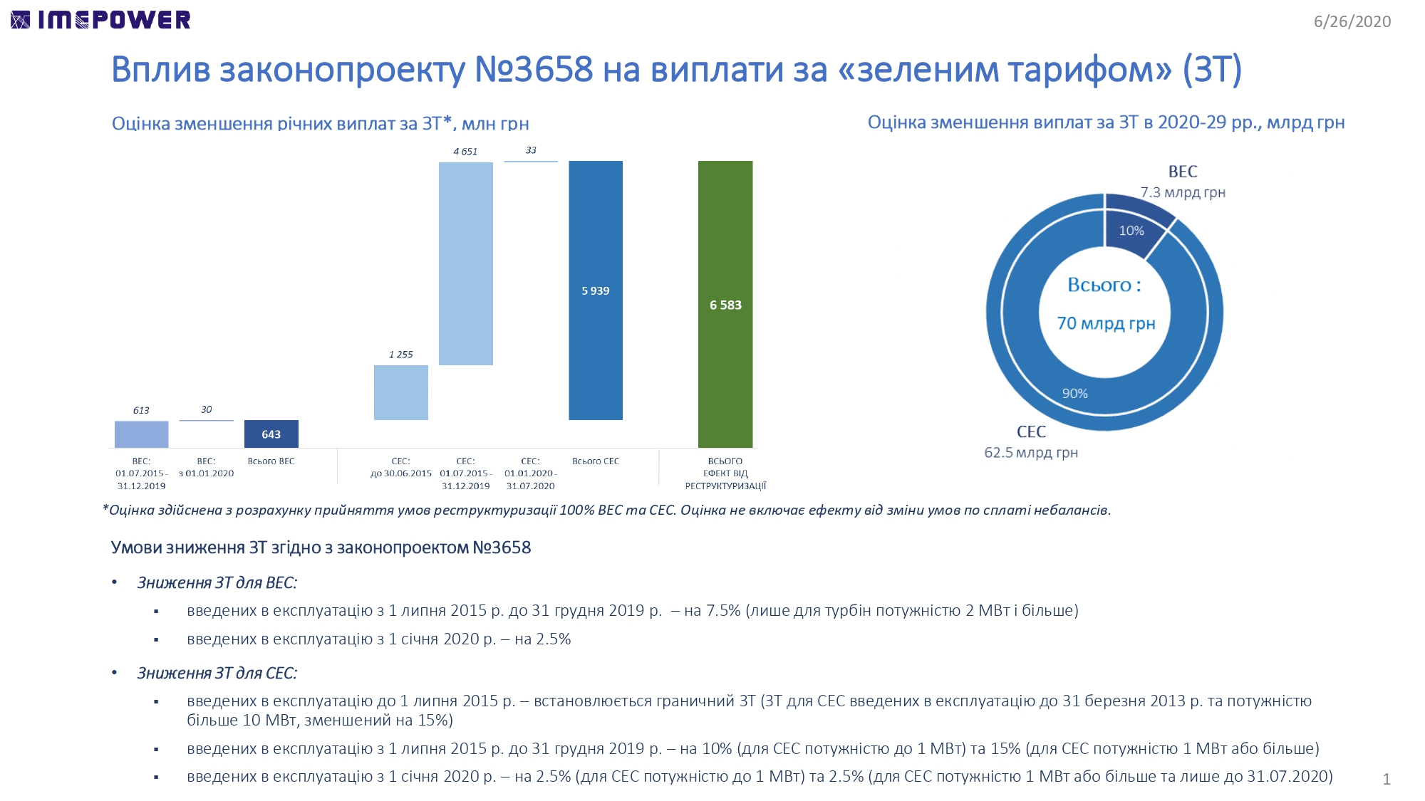 – для об’єктів введених в експлуатацію з 01 серпня 2020 року зниження  “зеленого” тарифу на 60%, що мають потужність від 1 МВт.
