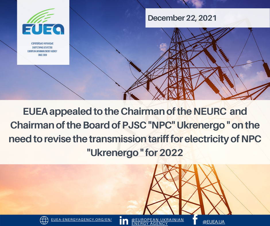 EUEA appealed to the Chairman of the NEURC and Chairman of the Board of PJSC “NPC” Ukrenergo ” on the need to revise the transmission tariff for electricity of NPC “Ukrenergo ” for 2022