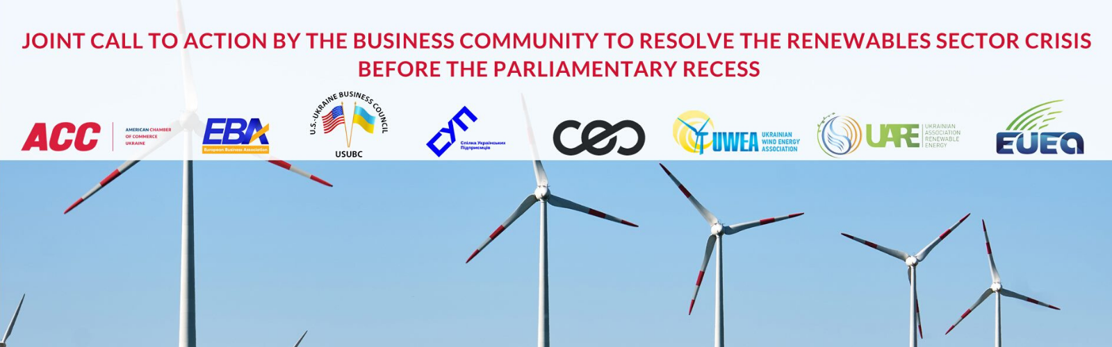 The business community united by the American Chamber of Commerce in UkraineEuropean Business AssociationU.S.-Ukraine Business Council (USUBC)Спілка Українських Підприємців – СУПCEO Club Ukraine, together with the three leading renewables associations in Ukraine: Українська Вітроенергетична АсоціаціяУкраїнська асоціація відновлюваної енергетикиEUEA/Європейсько-Українське Енергетичне Агентство, appeal to the Верховна Рада України to adopt Draft Law #3658 as a critical step toward resolving the renewable energy crisis in Ukraine. We appreciate the support of the President of Ukraine, Prime Minister, and Cabinet of Ministers, in resolving this crisis in the near-term.