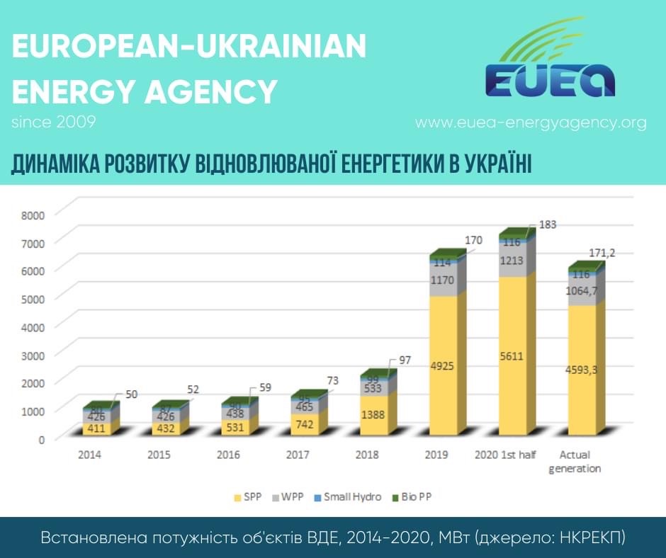 It should be noted that the statistics on obtaining the “feed-in” tariff (data from the NEURC) and the data of actually put into operation capacities (data from Ukrenergo) differ. According to Ukrenergo, the capacity actually put into operation is: solar power plants – 4593.3 MW, wind power plants – 1064.7 MW, bio-power plants – 171.2 MW, and only the data of small hydro power plants coincide – 116 MW. In total, the capacity actually put into operation in the first half of 2020 amounted to 5945 MW.