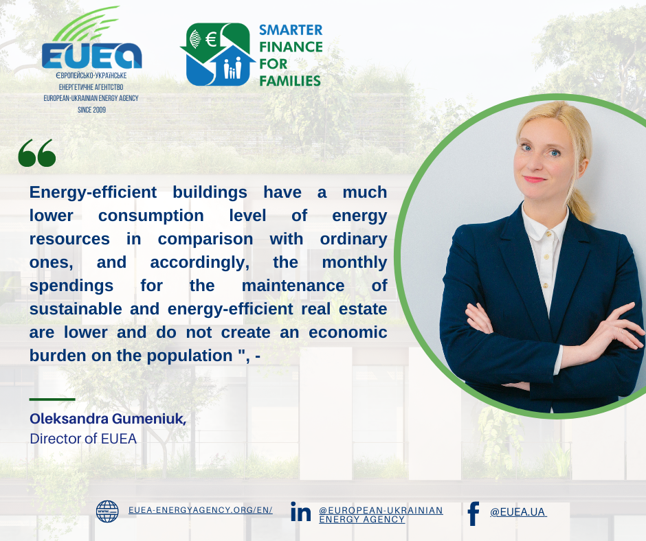 “Energy-efficient buildings have a much lower consumption level of energy resources in comparison with ordinary ones, and accordingly the monthly spendings for the maintenance of sustainable and energy-efficient real estate are lower and do not create an economic burden on the population “, – Oleksandra Gumeniuk, Director of EUEA.