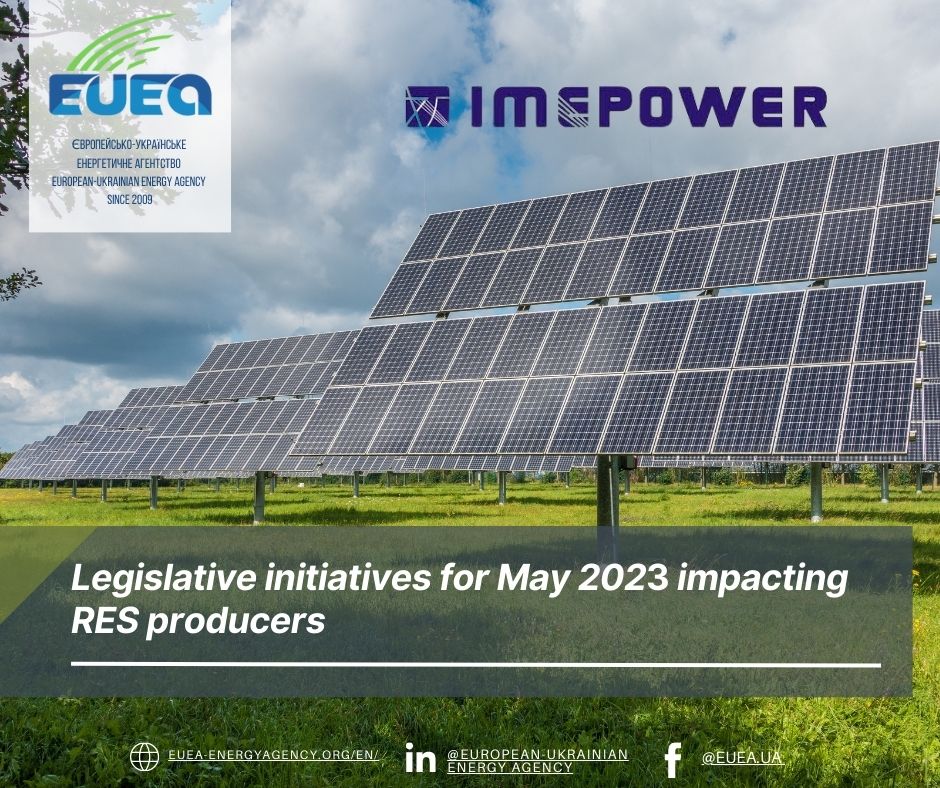Find out about the latest laws and registered draft laws of the Verkhovna Rada of Ukraine, decisions, resolutions, and orders of the CMU, Ministry of Energy of Ukraine and NEURC in the monitoring – “Legislative initiatives for May 2023 impacting RES producers” prepared by the EUEA Advisor – IMEPOWER.