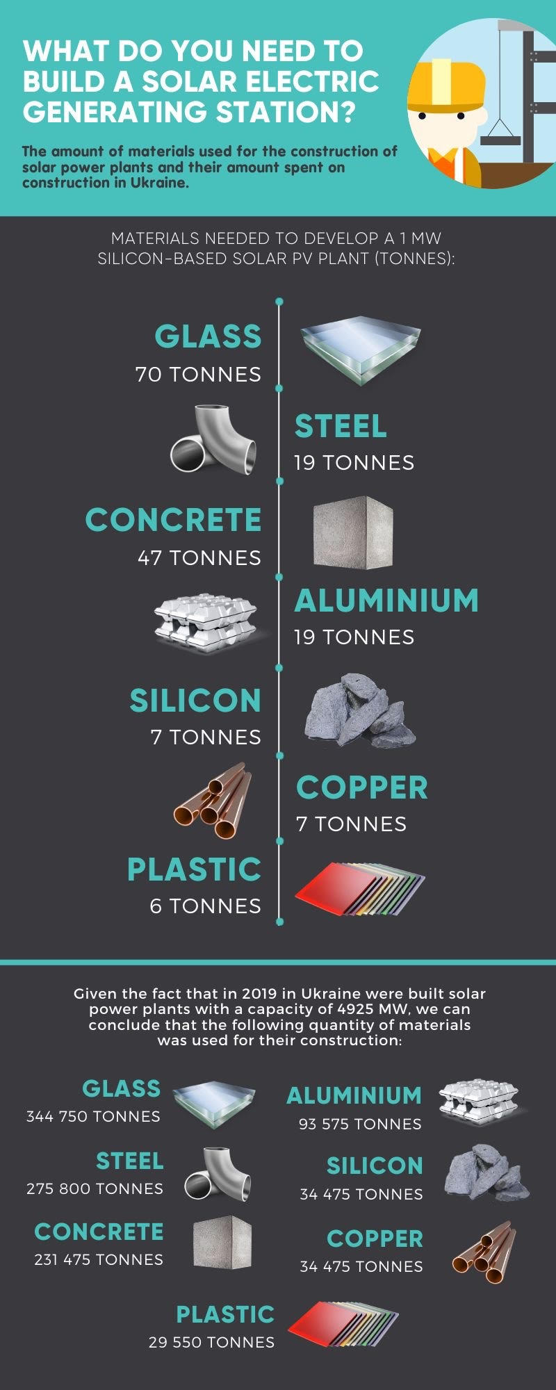 Figure illustrates the quantity of materials needed to manufacture and install 1 megawatt (MW) of silicon-based solar PV plant and the estimated amount of materials spent on the construction of solar power plants in Ukraine in 2019.