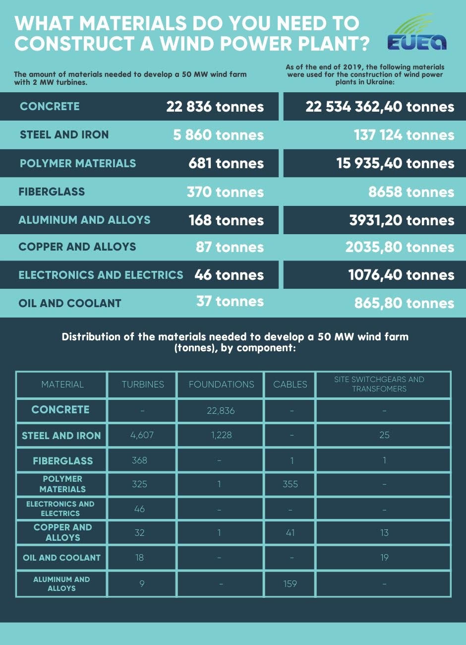 Figure illustrates the quantities of materials needed to develop a 50 MW wind farm with 2 MW turbines and the estimated amount of materials spent on the construction of wind power plants in Ukraine in 2019. And the distribution of materials needed for the development of a wind farm with a capacity of 50 MW (tons), by component.