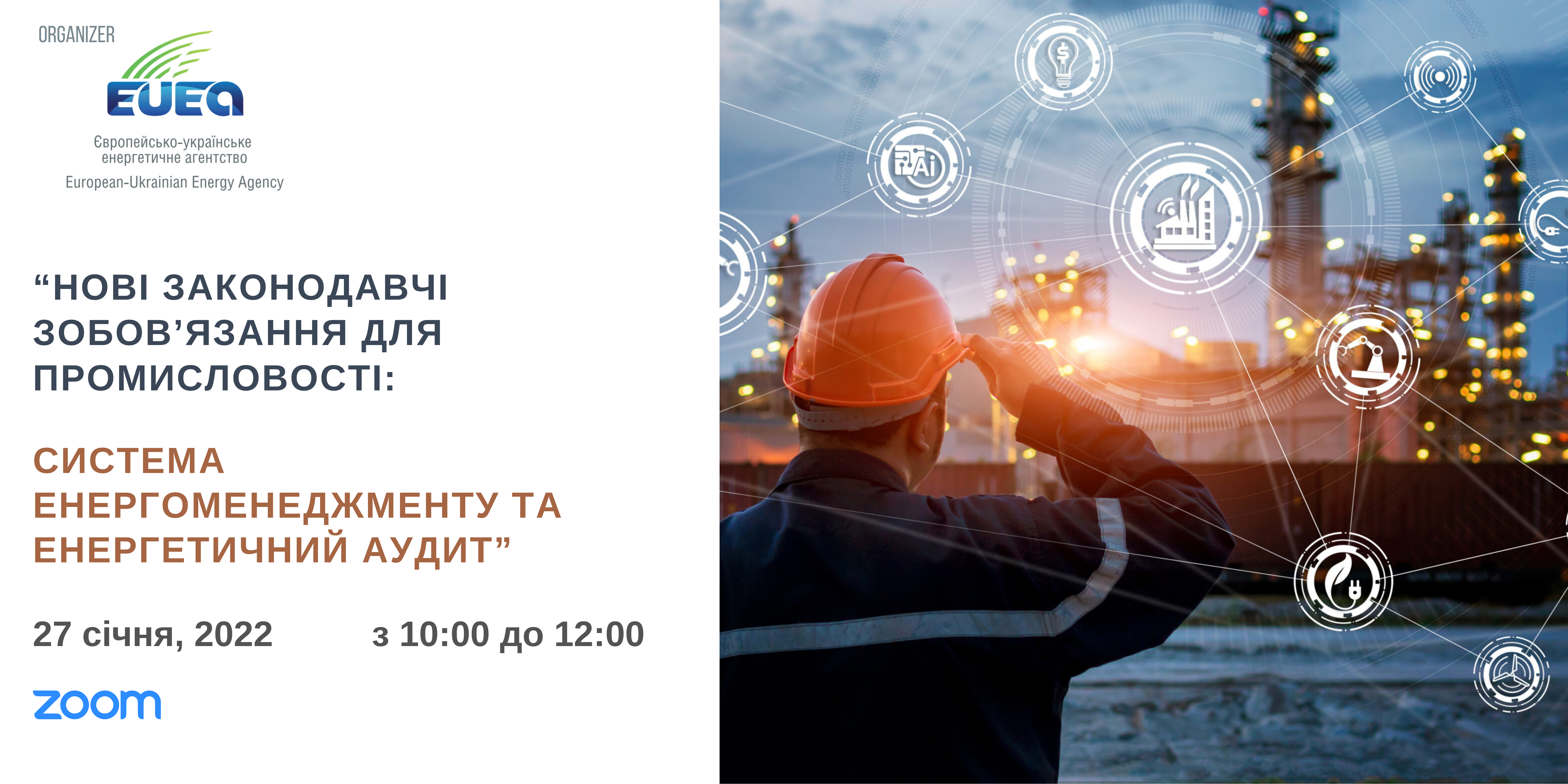 27 січня 2022 р з 10:00 по 12:00 онлайн-вебінар «Нові законодавчі зобов’язання для промисловості: система енергетичного менеджменту та енергетичний аудит»