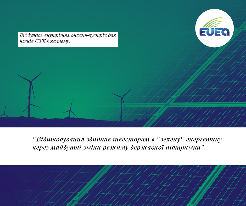 Відбулась внутрішня онлайн-зустріч для членів ЄУЕА на тему: “Відшкодування збитків інвесторам в “зелену” енергетику через майбутні зміни режиму державної підтримки”