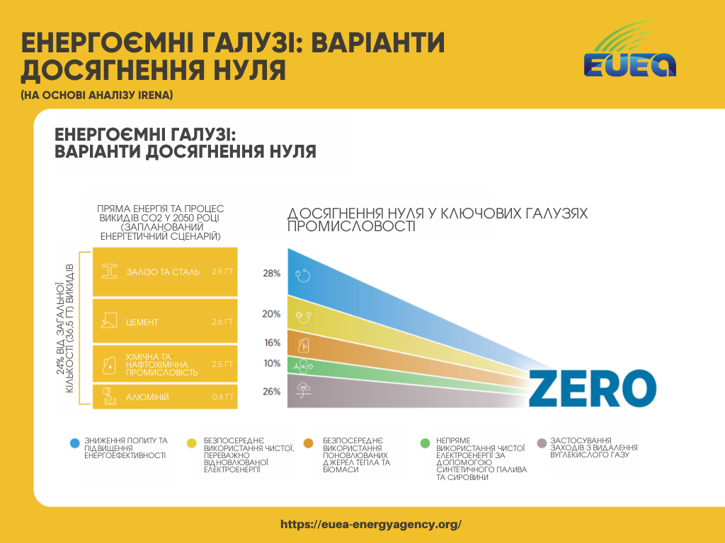 Більшість енергії, що використовується в промисловості, тепер отримується з викопного палива. Але використання енергії не є єдиним джерелом викидів у промисловому секторі. Викиди СО2 також повинні бути виключені з виробничих процесів та життєвого циклу продукції. Зменшення викидів та врешті-решт досягнення нуля потребуватимуть кардинальних змін у способі виробництва, споживання та утилізації таких матеріалів.