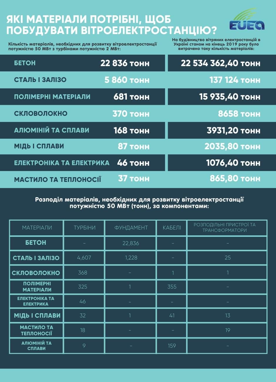 Інфографіка ілюструє кількість матеріалів, необхідних для розвитку вітроелектростанції потужністю 50 МВт з турбінами потужністю 2 МВт та розрахункову кількість матеріалів витрачених на будівництво вітряних електростанцій в Україні станом на кінець 2019 року. А також розподіл матеріалів, необхідних для розвитку вітроелектростанції потужністю 50 МВт (тонн), за компонентами.