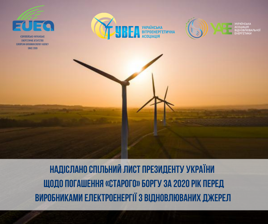 Європейсько-українське енергетичне агентство (ЄУЕА), Українська вітроенергетична асоціація (УВЕА) та Українська асоціація відновлюваної енергетики (УАВЕ) надіслали спільний лист Президенту України Володимиру Зеленському із проханням у повному обсязі забезпечити виконання положень Меморандуму без будь-яких подальших затримок. Нагадаємо, що борг перед виробниками електричної енергії з відновлюваних джерел на кінець 2020 року склав 22,4 млрд грн.