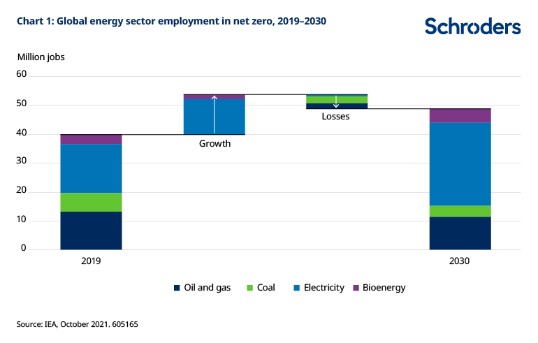 Зокрема, в аналізі МЕА зазначається, що шлях досягнення чистого нуля до 2050 року може призвести до збільшення робочих місць у енергетичному секторі на 14 млн. За прогнозами, цей приріст відбудеться до 2030 року завдяки новим інвестиціям у сектор чистої енергетики та буде компенсований можливим скороченням на 5 млн у промисловості викопного палива. Результатом є потенційний чистий приріст 9 млн робочих місць у всьому світі протягом наступного десятиліття.