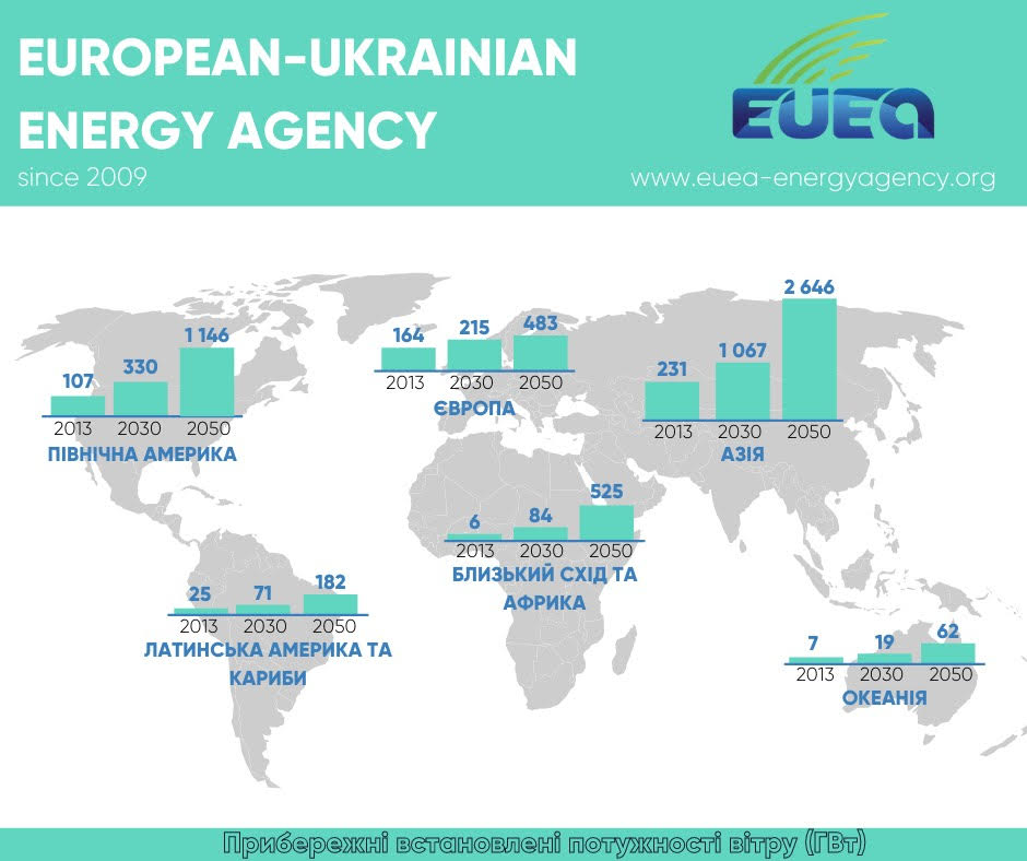 Для досягнення цієї мети встановлена в світі потужність вітрової енергії повинна досягати 6000 ГВт – що в 10 разів перевищує поточний рівень – до 2050 року. Це включало б 5 000 ГВт берегового вітру та 1 000 ГВт морського вітру. Азія готова стати світовим домінуючим вітровим ринком, на 2050 рік припадає понад 50% морських вітрових установок і 60% офшорних вітрових установок.